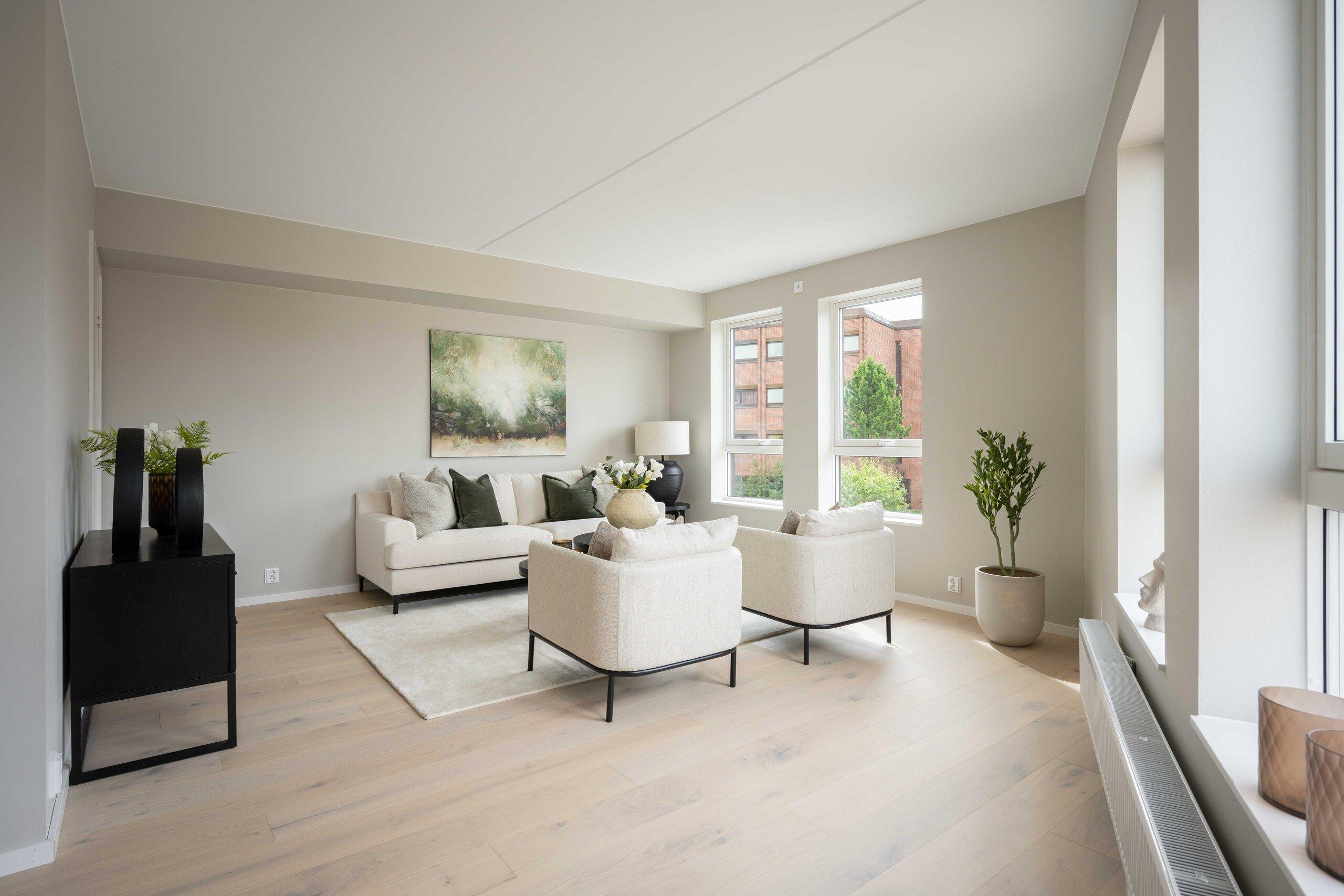 • Oppgraderte gulv med 1-stav hvitpigmentert eikeparkett.