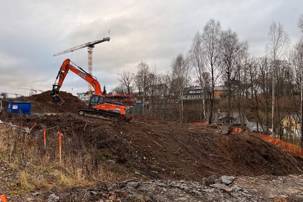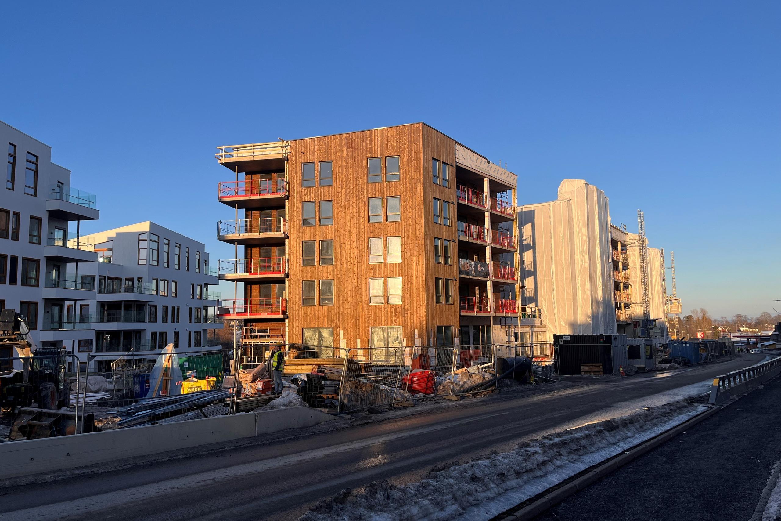 Som man kan se begynner Fusdal Torg virkelig å ta form. Bygget med den flotte trekledningen er hus 1 og huset med presenningen er hus 2. Presenningen vil tas bort om kort tid og da vil den lekre teglstenen komme til syne. Følg med!