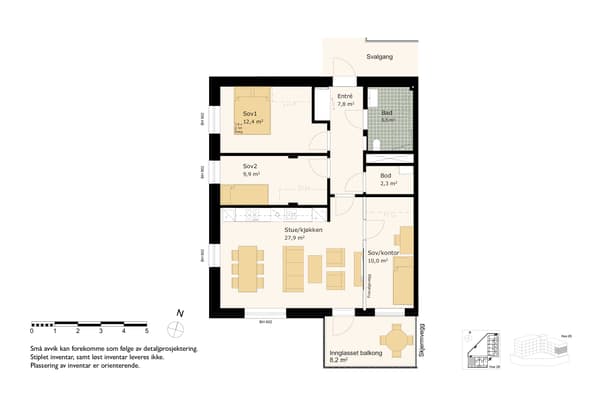 I planløsningen vises disponeringen av boligarealet. Se informasjon som mål, hvordan rommene er inndelt og plassering av balkongen.