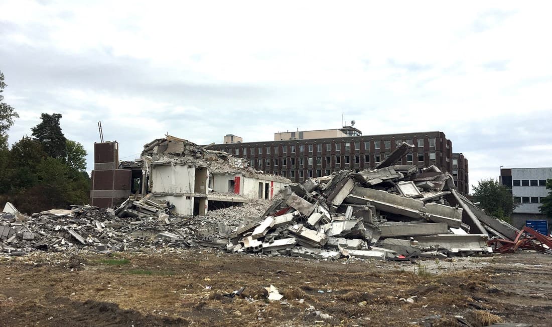 Vi er i gang med forberedende arbeider på tomten. Kontorbygget hvor de første byggene skal oppføres er nå revet.
