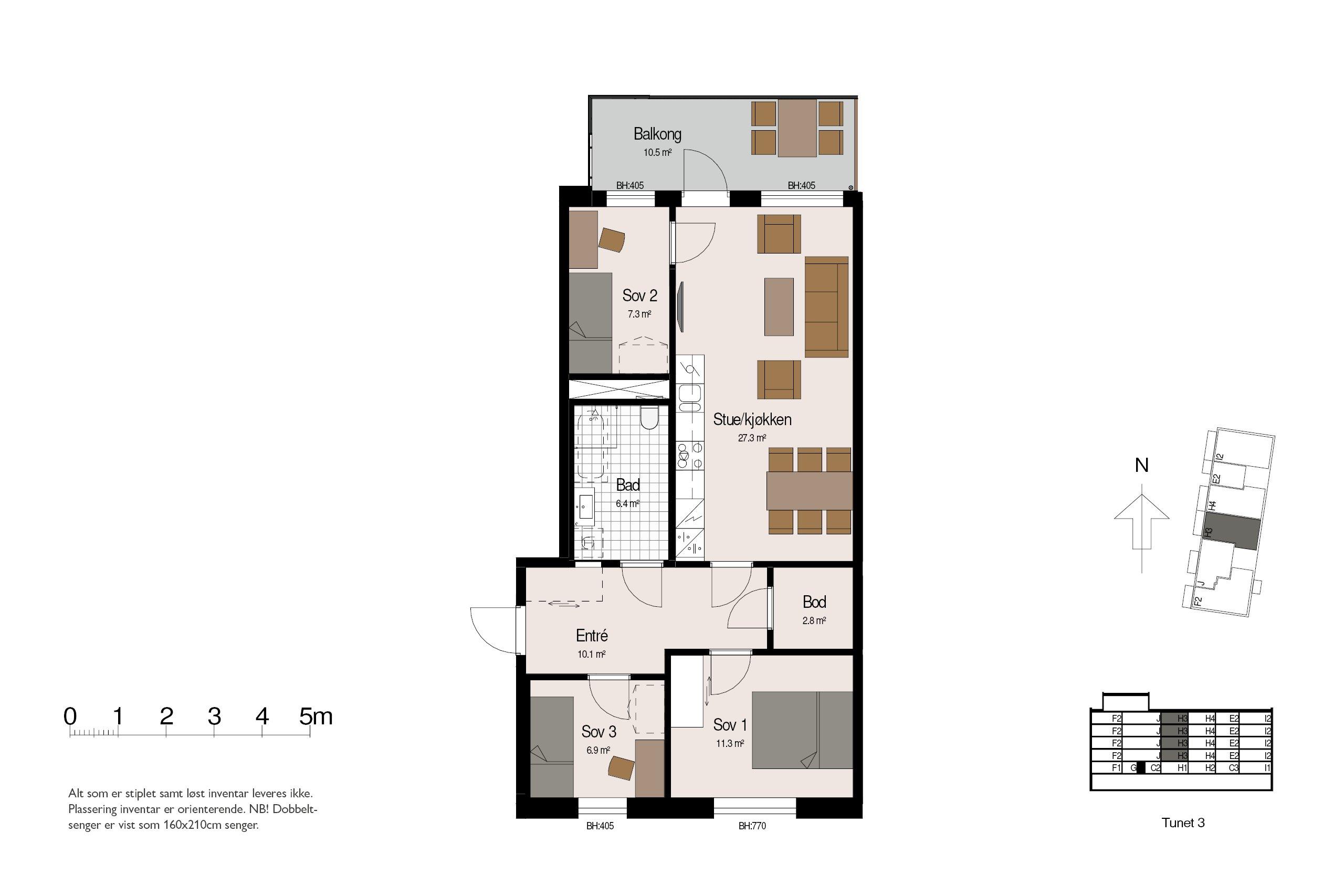 I planløsningen vises disponeringen av boligarealet. Se informasjon som mål, hvordan rommene er inndelt og plassering av balkongen.