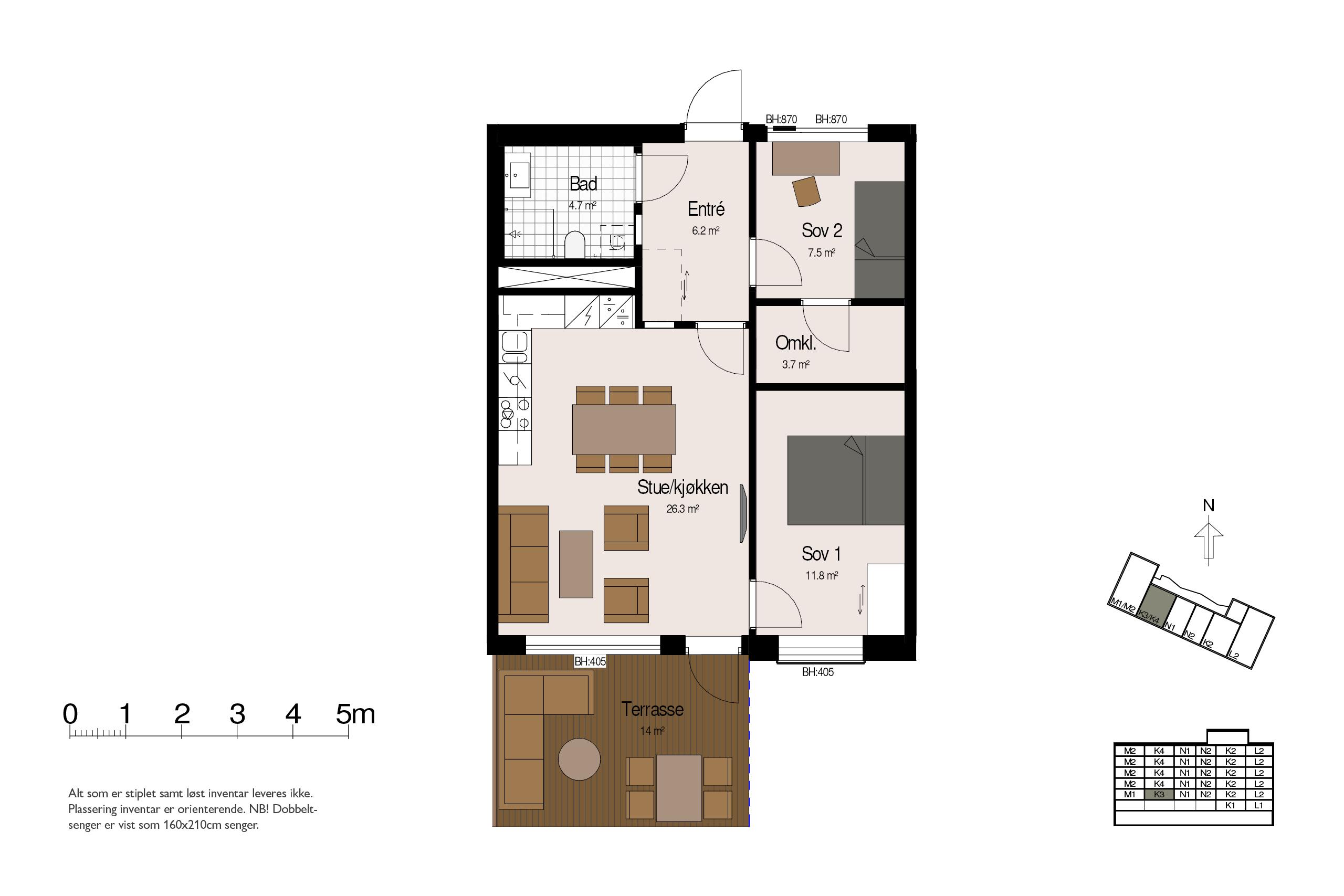 • Åpen stue/kjøkkenløsning med integrerte hvitevarer