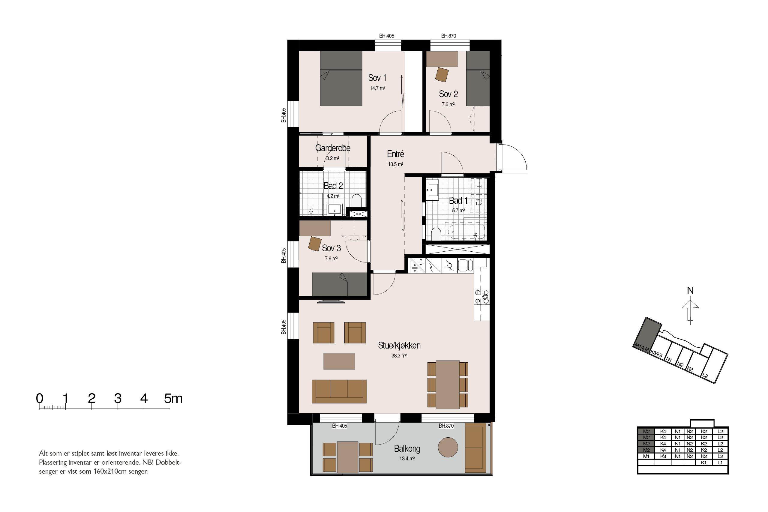 I planløsningen vises disponeringen av boligarealet. Se informasjon som mål, hvordan rommene er inndelt og plassering av balkongen.