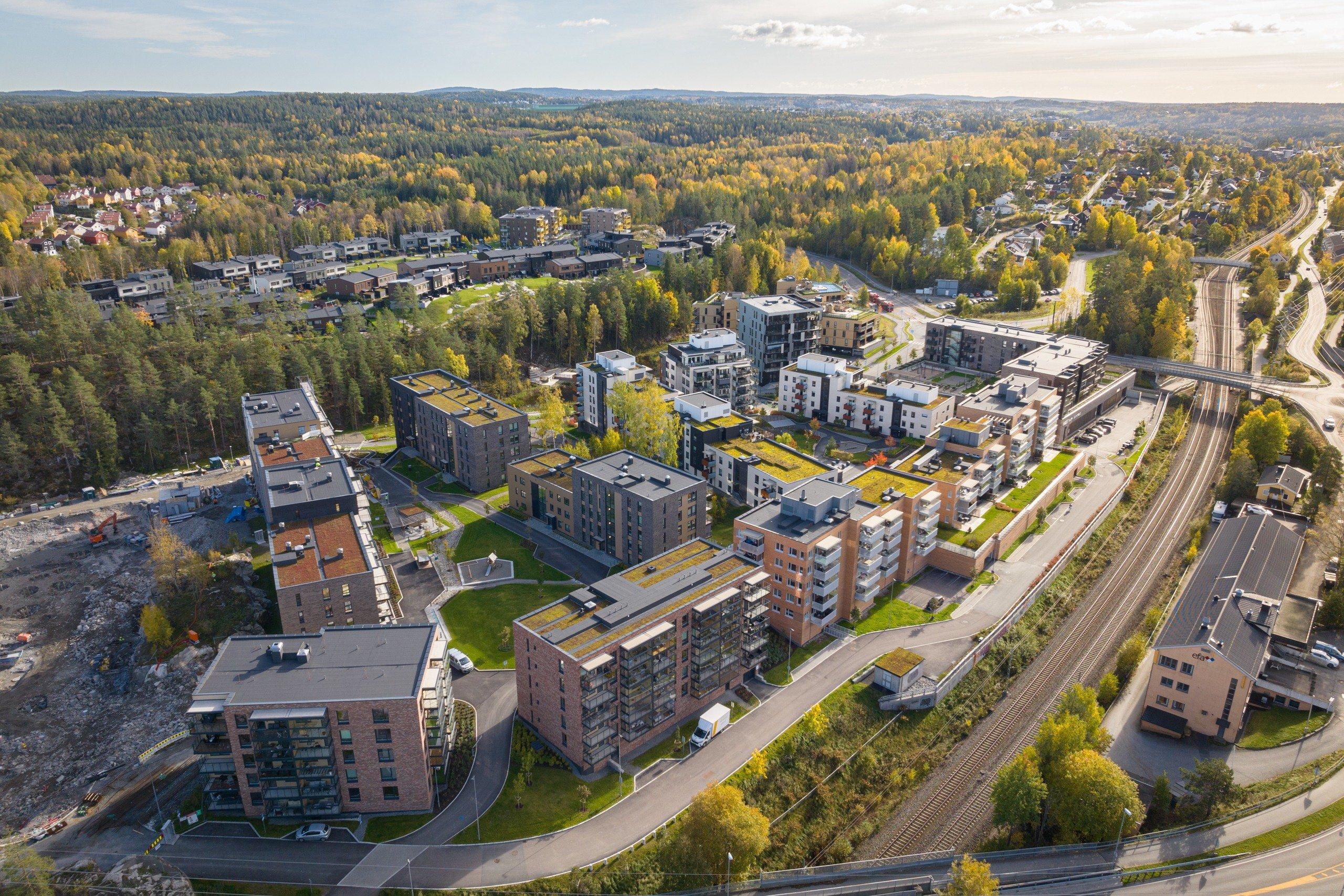 I solskinnet 16. oktober var vi oppe med dronen over Myrvoll stasjon og knipset noen foto av husene og de grønne områdene. Hus 14 og 15 er snart 100% klare både innvendig og utvendig. Aktiviteten begynner også å bli synlig på Skogbrynkvartalet, hvor hus 17, 18 og 19 er de første som skal reise seg.