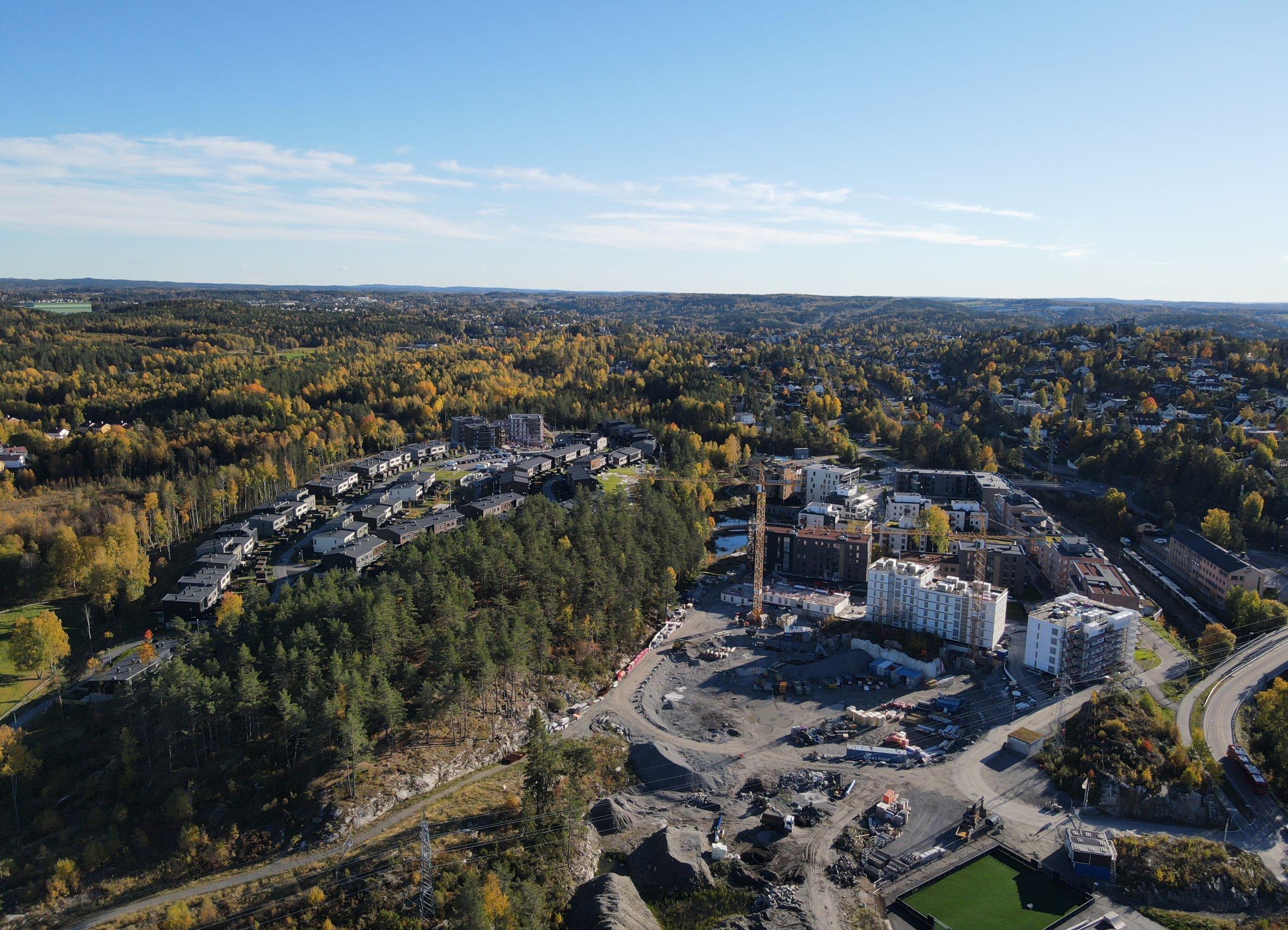 I starten av oktober tok vi en status fra luften på Myrvoll Stasjon, hvor vi ser at også hus 14, 15 og 16 begynner å komme til rette på området, samt plassen som er ryddet for Skogbrynkvartalet og de neste husene. Her ser vi også en fin sammenheng med Skogsåsen med rekkehus og leiligheter.