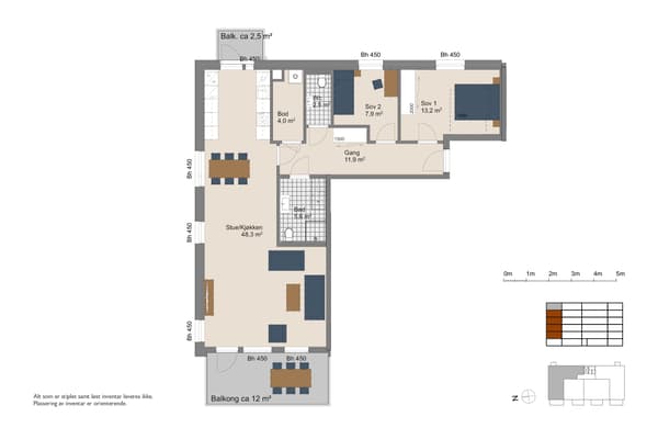 I planløsningen vises disponeringen av boligarealet. Se informasjon som mål, hvordan rommene er inndelt og plassering av balkongen.