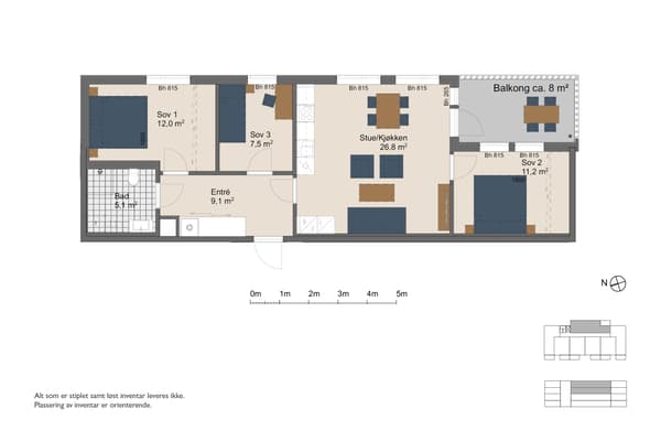 I planløsningen vises disponeringen av boligarealet. Se informasjon som mål, hvordan rommene er inndelt og plassering av balkongen.