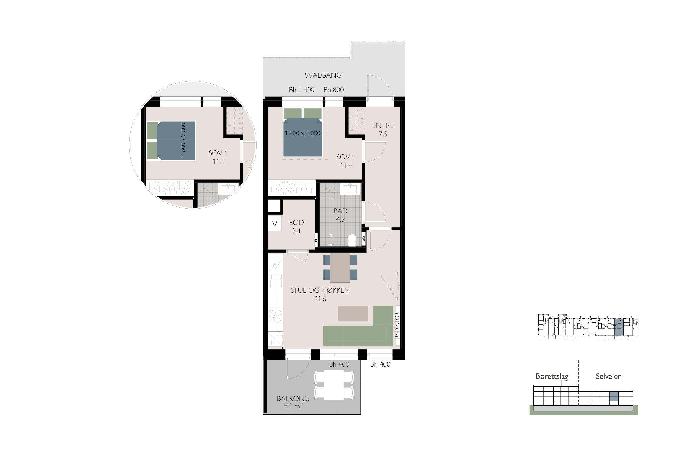 • 2-roms leilighet med adkomst fra svalgang