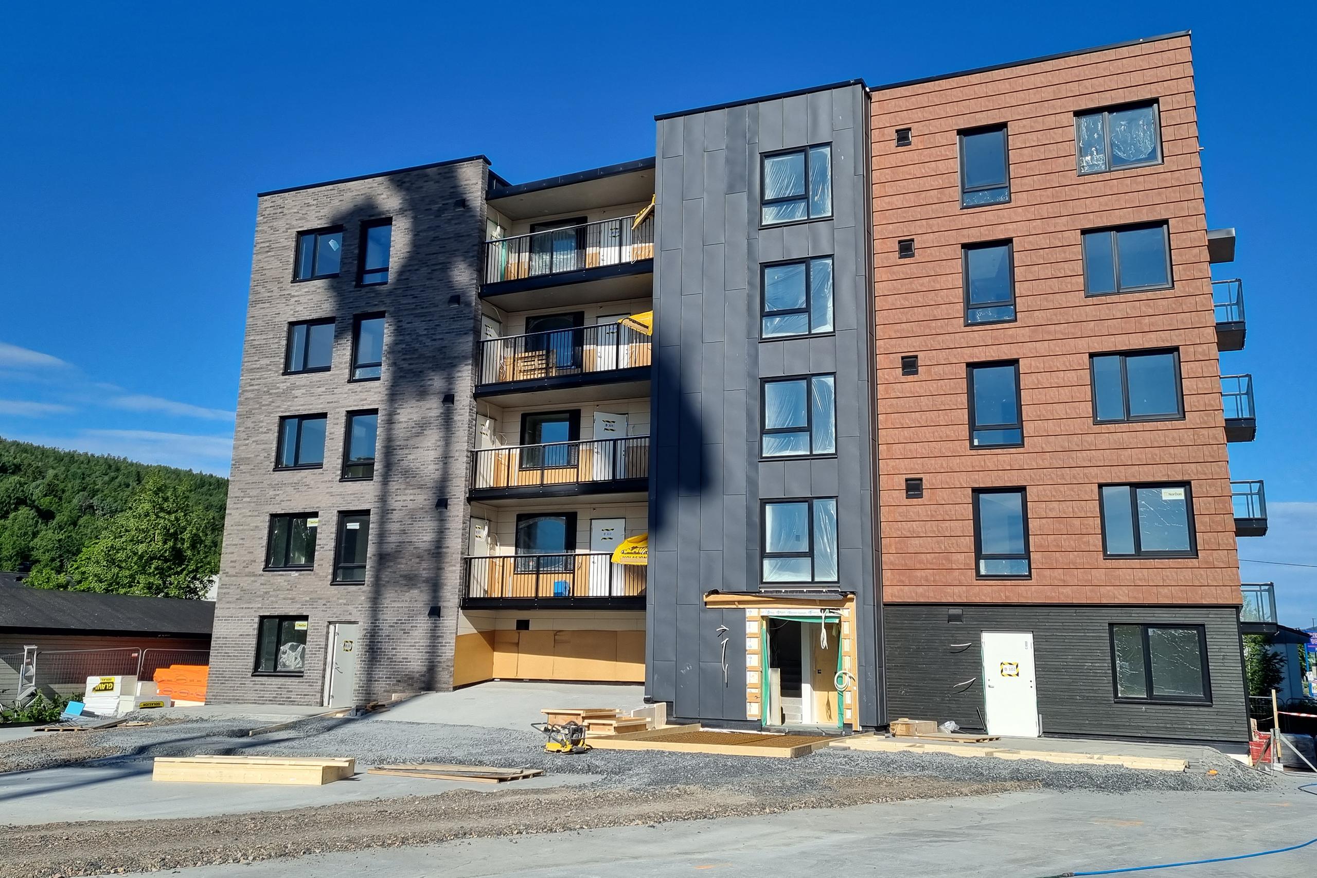 Det jobbes nå med å ferdigstille leilighetene som kjøkken, tekniske installasjoner, parkett og listverk i bygget. Skulle du legge søndagsturen forbi tomta, vil du se at fasaden nå er ferdig.