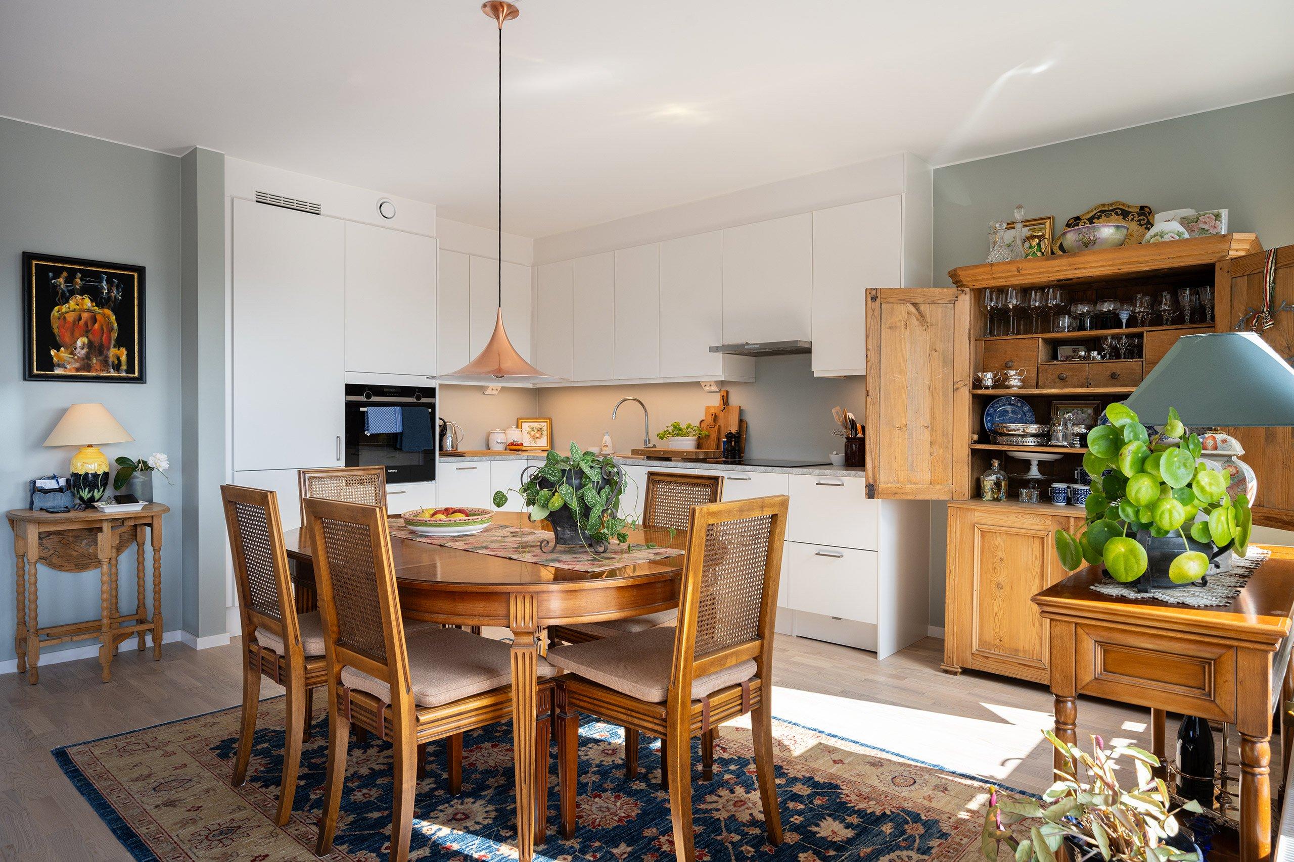 Ekteparet klarte å finne plass til nesten alle sine eksisterende møbler fra eneboligen i leiligheten på 93 kvm, og det fungerer meget bra.