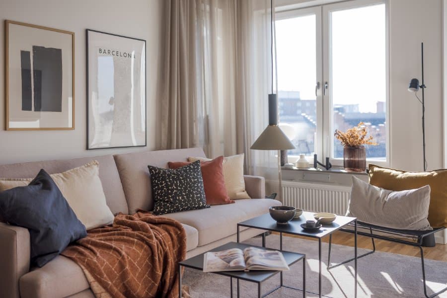 Invester i møbler, tekstiler og interiørdetaljer med farger du kan finne i naturen, og velg interiør i naturmaterialer som tre, betong og stein for å få den rette følelsen. Med høstens vakre, varme farger i kombinasjon med beige, grå og grønne toner, kan du enkelt skape en harmonisk og koselig atmosfære i hjemmet ditt. For de av dere som ønsker å fange en sterk trend i høstinnredningen, er også sennepsgult og blått aksentfarger denne sesongen. For de som ønsker å ta den litt lenger er disse fargene fine for større flater som møbler og hele vegger. Vårt beste tips til deg som ønsker å gjøre en enklere endring er å heller fokusere på detaljer som enkelt kan byttes ut, som for eksempel gardiner, pynteputer, vaser og bilder i dine favorittfarger fra høstens herlige trendpalett.