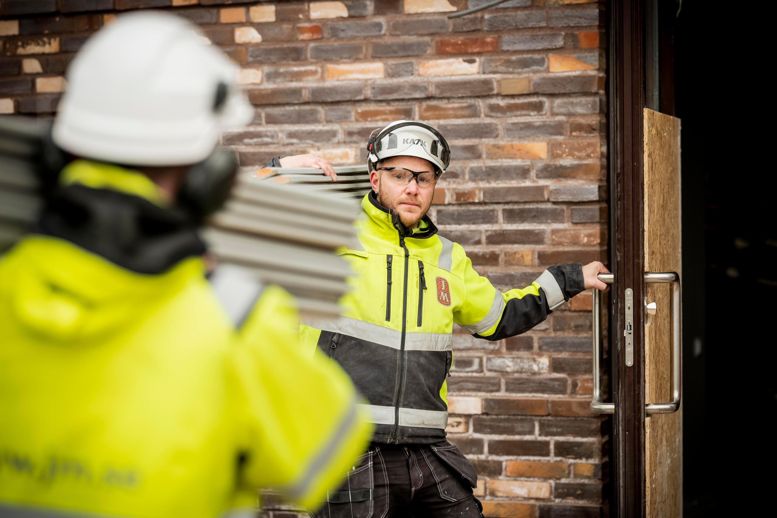 Våre logistikkmedarbeidere tar imot materialleveranser om ettermiddagene, for deretter å transportere innredningsmaterialet til de enkelte leilighetene. På den måten utnytter vi flere av døgnets timer og skaper gode forutsetninger for JMs håndverkere.