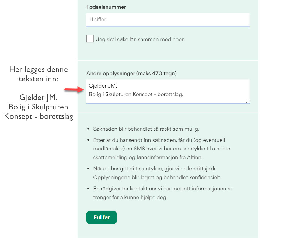 På bildene under ser du hva som er viktig å få med i søknadsskjemaet, kontakt gjerne salgsleder for Skulpturen Borettslag i forkant for tips om en raskere søknadsprosess.