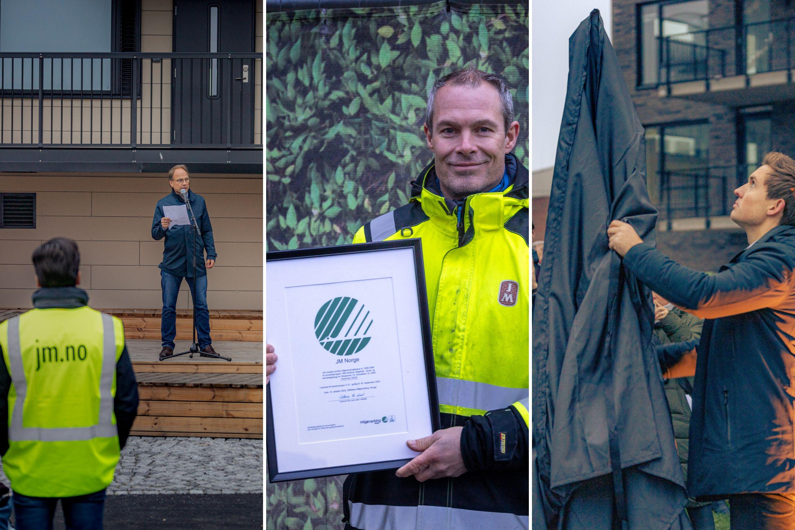 For å markere den nye skulpturen og lisensen tok flere ordet, og JM fikk mye positiv omtale for sitt Svanemerkede prosjekt. Ståle Jørgensen, varaordfører i Drammen, PV arkitekter, Tormod Lien fra Svanemerket, var blant deltakerne som skrøt av prosjektet og integreringen av skulpturer i prosjektplanen.