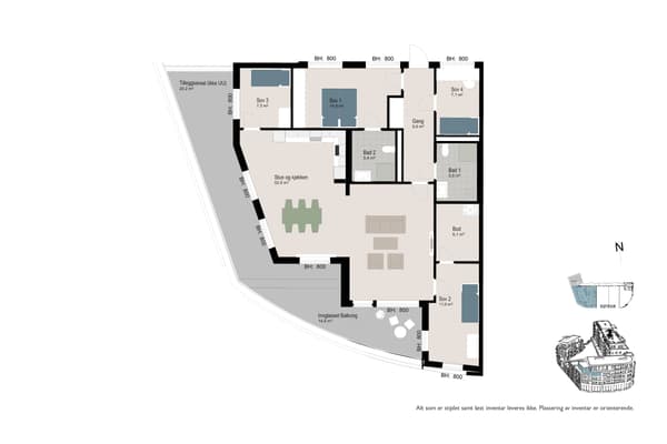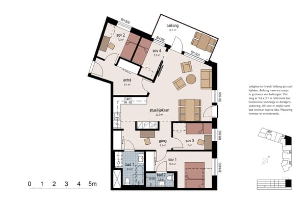 I planløsningen vises disponeringen av boligarealet. Se informasjon som mål, hvordan rommene er inndelt og plassering av balkongen.