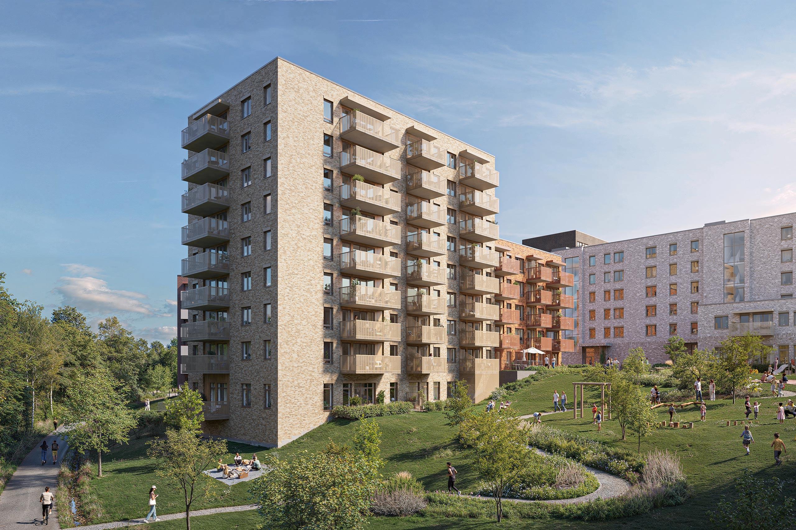 Hjertet i prosjektet blir den store, flotte parken. Her skapes et naturlig samlingspunkt for både små og store, med plass til lek, opphold og rolige stunder. Parken skal invitere til aktivitet og sosialt liv, men også gi rom for stillhet og være et grønt pusterom rett utenfor døren.