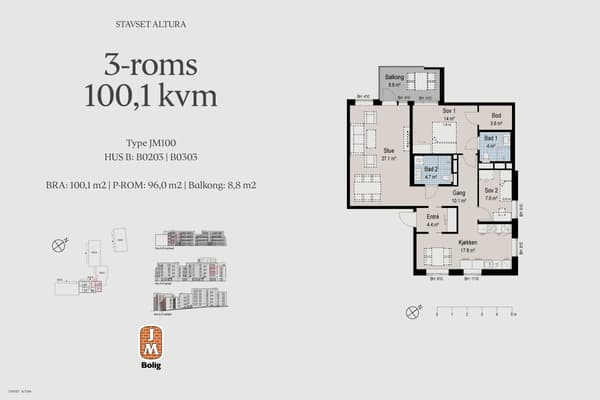 | Ledig | 3 | kr 6 917 472 | kr 6 890 000 | kr 2 622 | 100.1 m² | 3 / 4 | Inkludert | B0303 | Les mer om objekt B0303 |