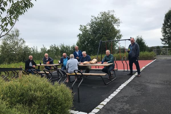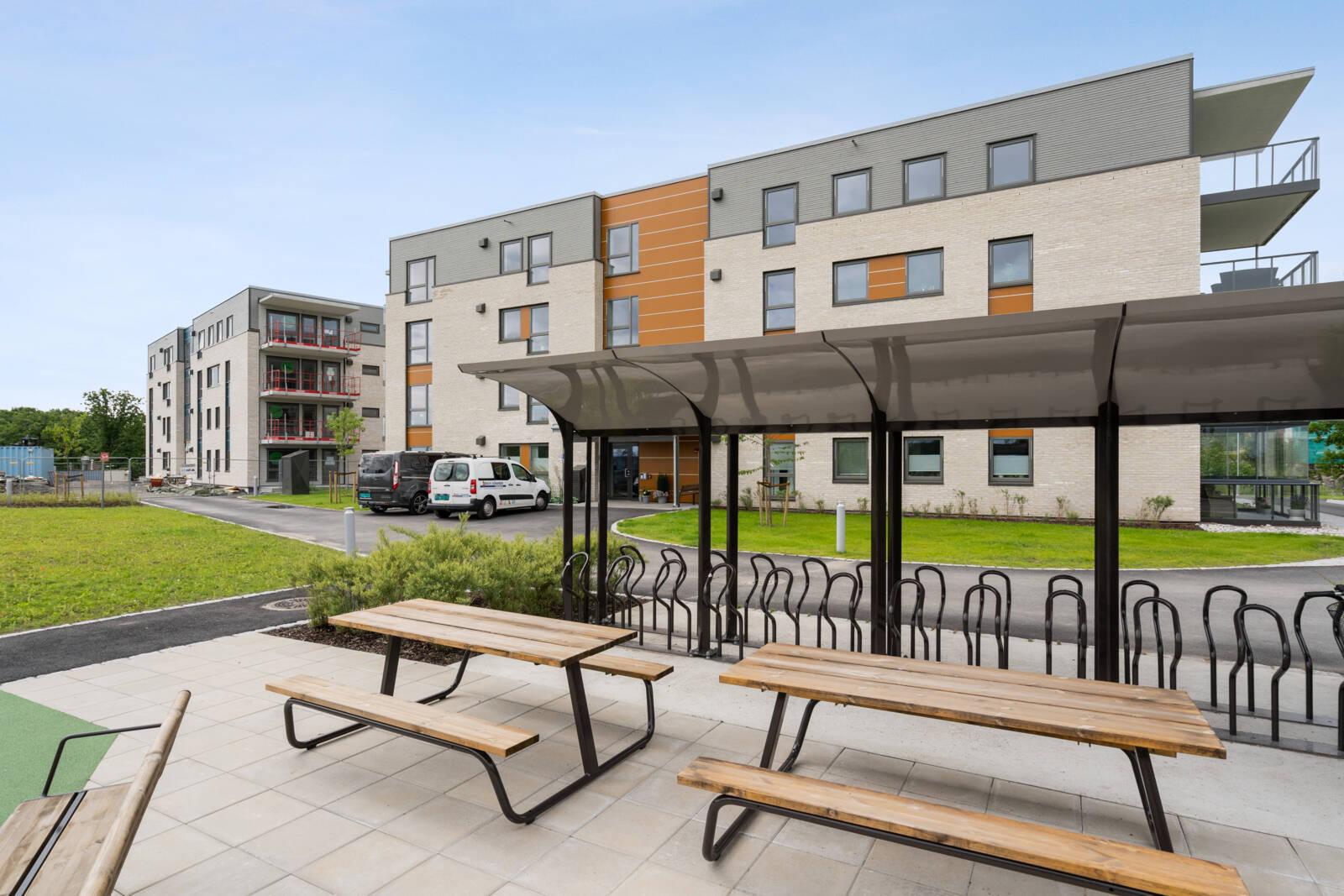 Utenfor bygg A og B har det blitt riktig så flott i sommer med beplantning, sittegrupper og lekeplass. Miljøstasjonen er hensiktsmessig plassert ved parkeringsområdet. God plass til sykler i eget område med tak.