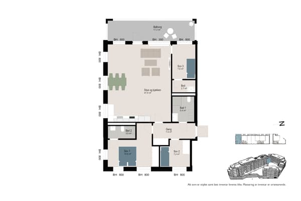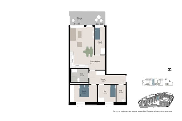 - Stue med åpen kjøkkenløsning og utgang til vestvendt balkong på 13 kvm