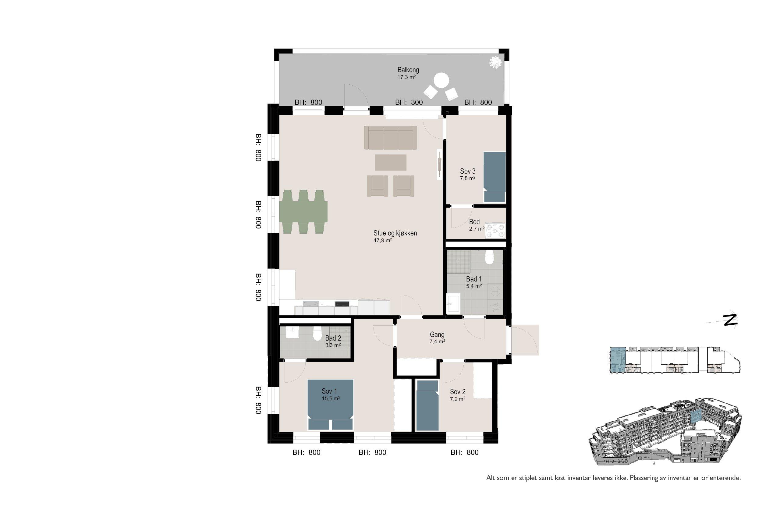 - 3 soverom – ett med direkte tilgang til bad