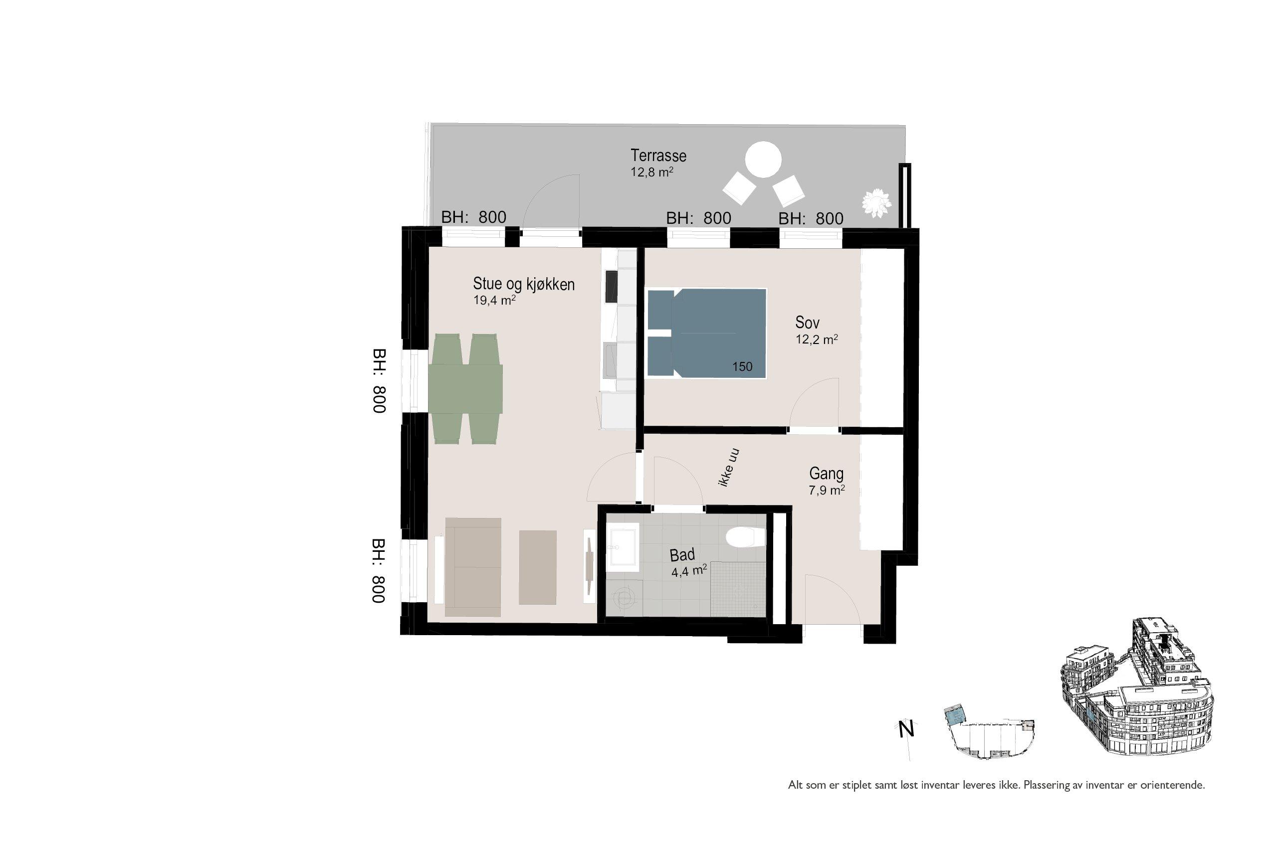Leiligheten har et moderne bad og en lys stue med åpen kjøkkenløsning, som skaper en sosial og luftig atmosfære. Fra stuen har du direkte utgang til en romslig terrasse – ideell for morgenkaffen, avslapping eller hyggelige kvelder med venner.