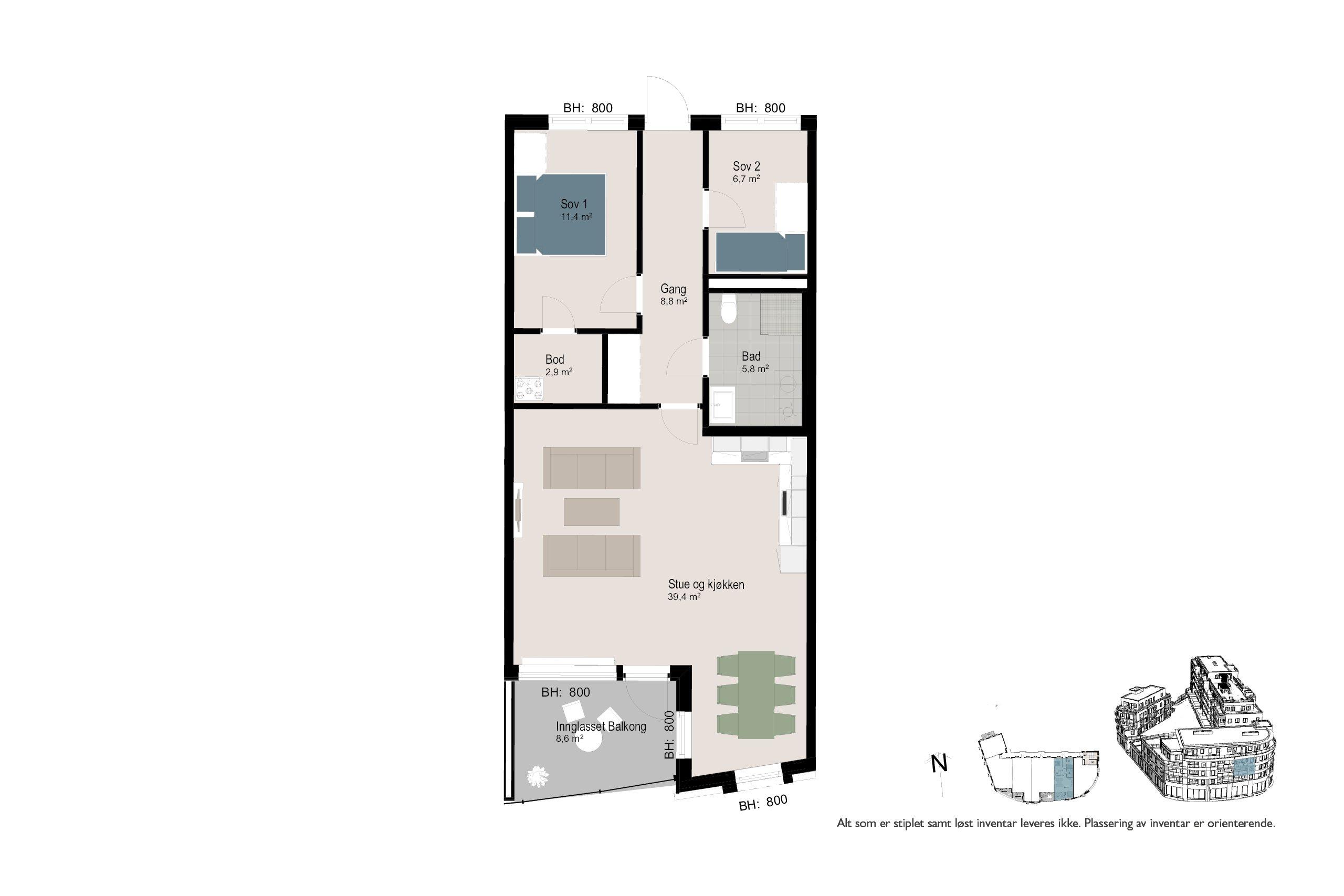 Leiligheten har to soverom, et praktisk bad, innvendig bod, og en innglasset balkong på 8,6 m² som gir deg en lun uteplass året rundt. Her får du en gjennomtenkt planløsning med gode oppbevaringsmuligheter og en behagelig atmosfære.